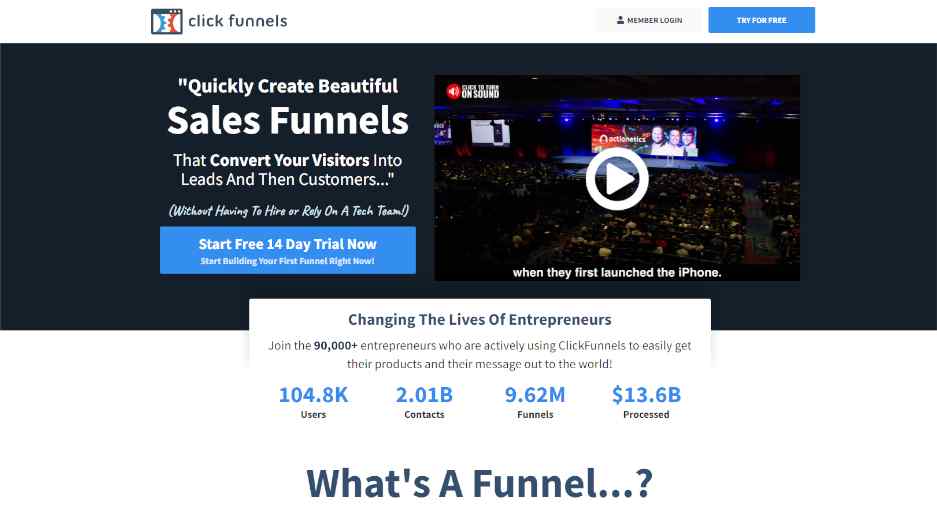 It is a funnel builder and marketing tool for entrepreneurs who don't know how to code. With ClickFunnels, you can create sales funnels, webinars, membership sites, and more.